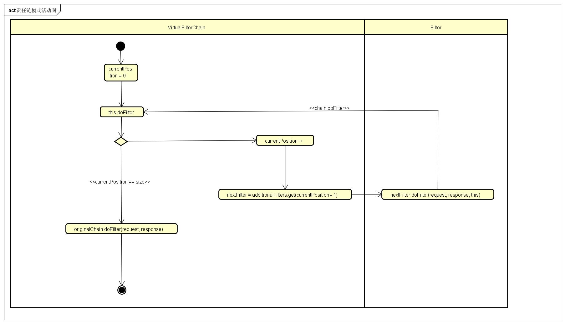 源码解析:currentPosition表示责任链的要处理请求链条节点的位置,使用additionalFilters来依次处理request请求。additionalFilters中的每个Filter成员都承担某一项具体职责,并且每个Filter都会被执行到。 责任链条的成员执行完自己的职责后,会回调链条的处理请求方法,责任链条会找到下一个链条成员来执行职责,直到链条尾端。