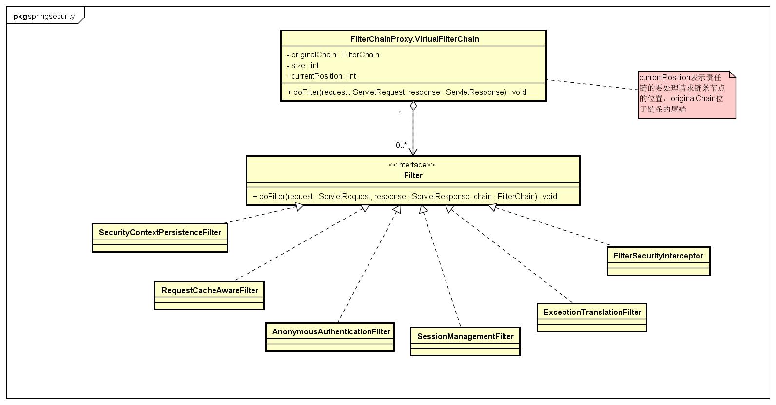链条成员Filter会执行chain.doFilter(request, response )方法,而chain是链条本身的引用,这样成员就将请求又重新交给了链条。看SecurityContextHolderAwareRequestFilter源码: