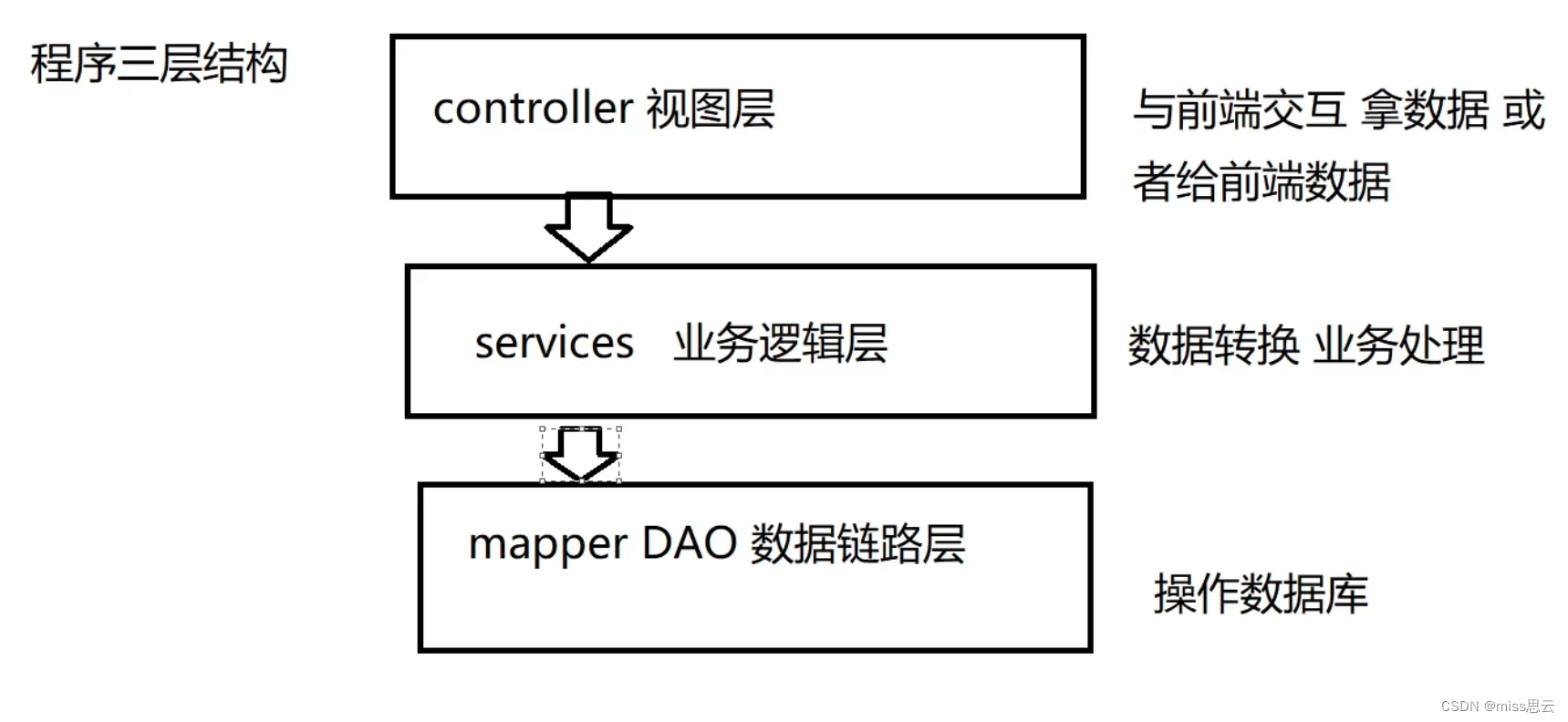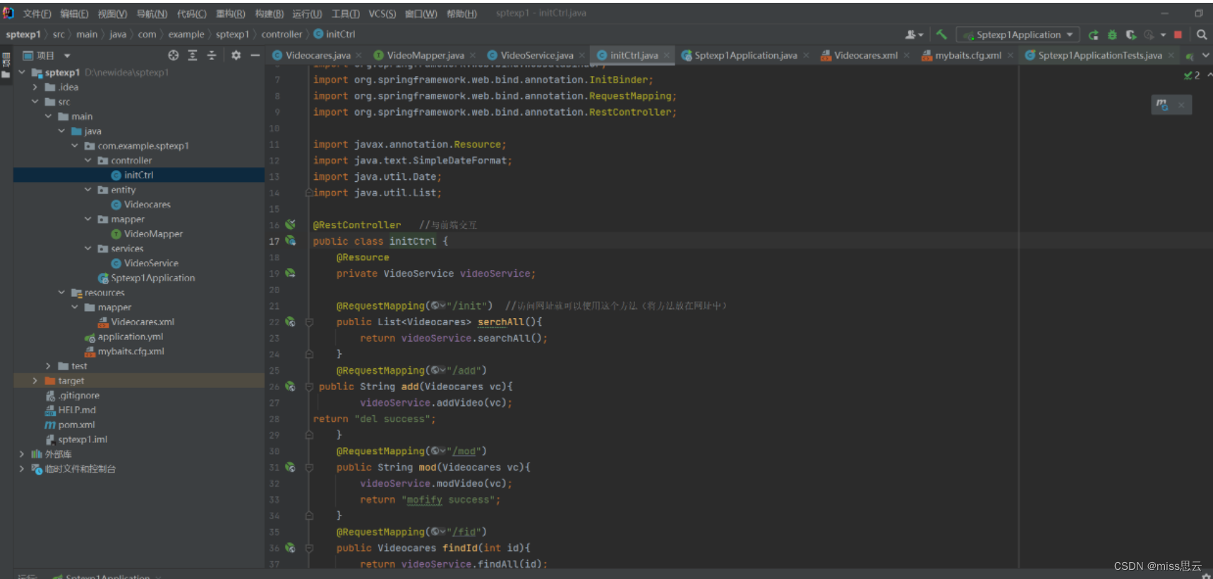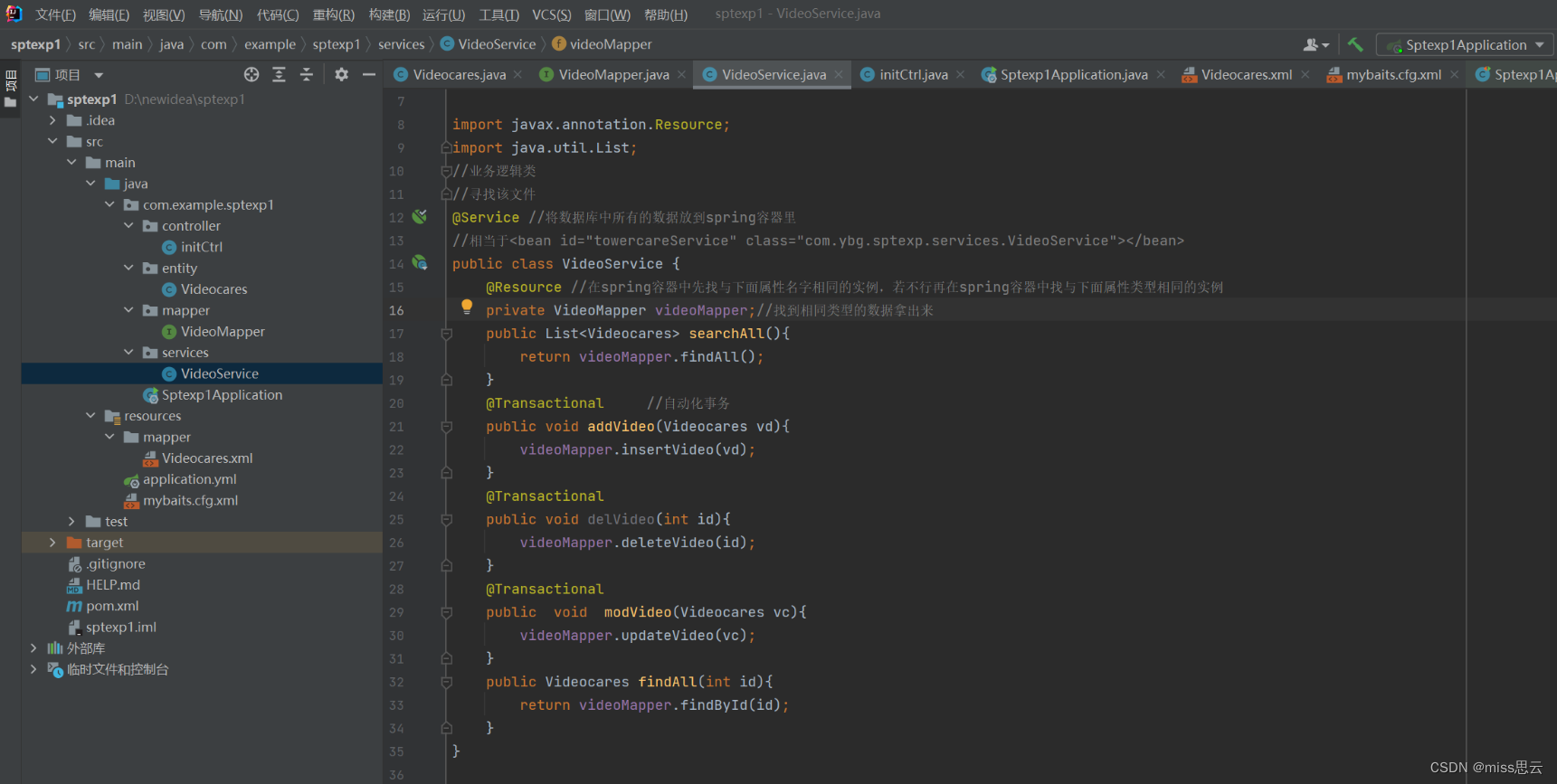 3.写服务类--->services下 1.类头上@Service 2.类属性上mapper接口上@Resource 4.写controller类--->controller下 1.类头上@RestController与前端交
