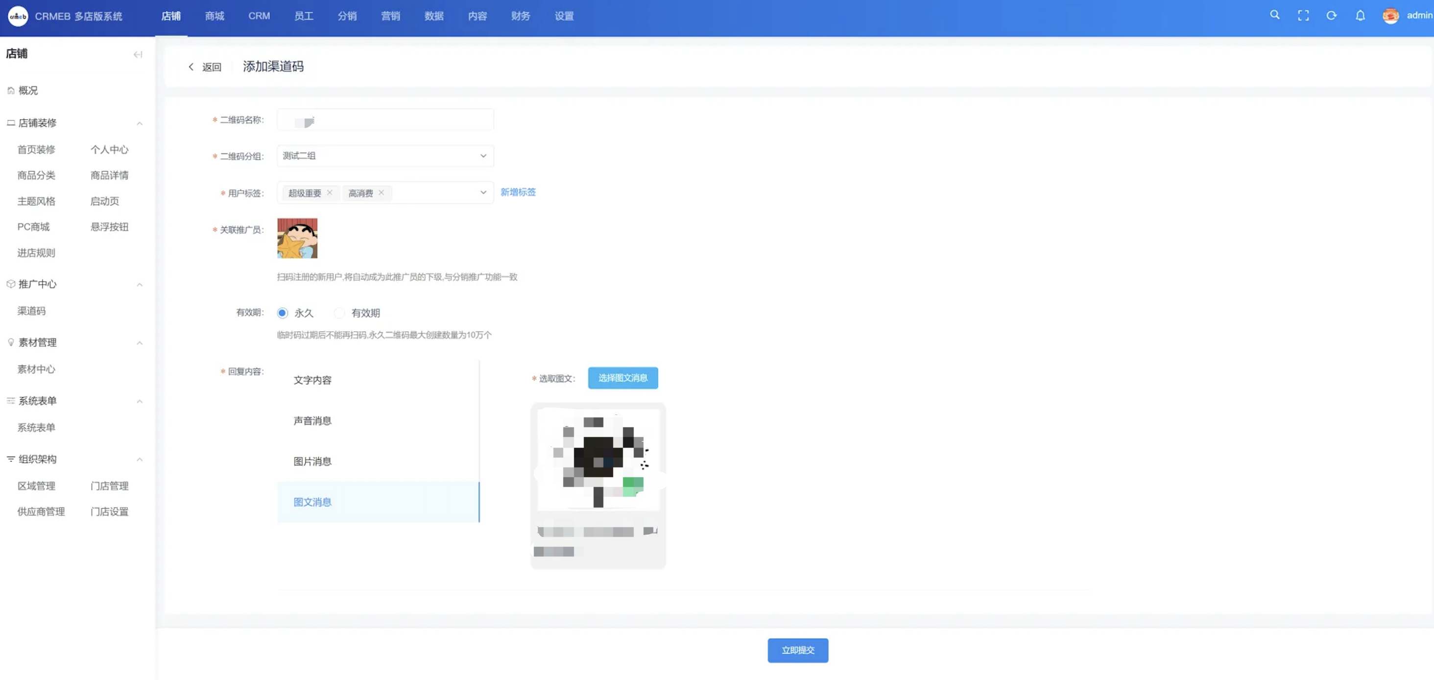 (4)回复内容:用户扫描渠道码进入公众号后,给用户发送的消息。支持:文字、声音、图片、图文类型。