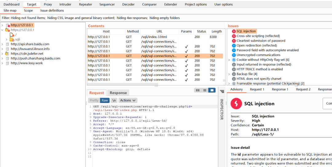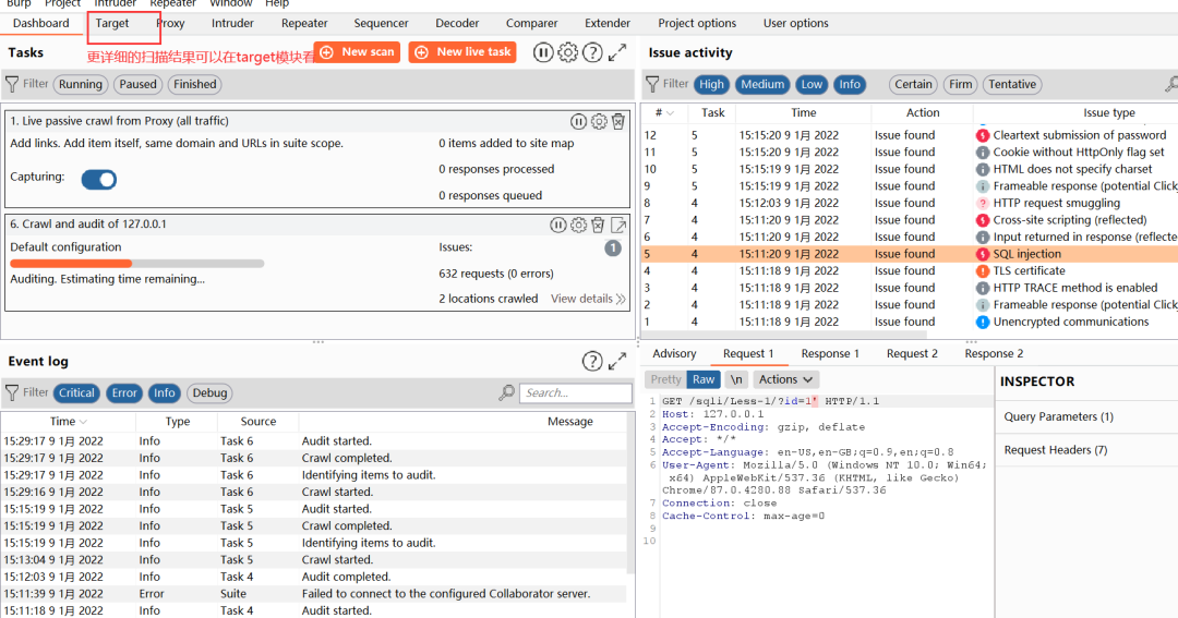 扫描结果:更详细可以点击项目的右下角view模块,看到爬取的url信息与扫描结果