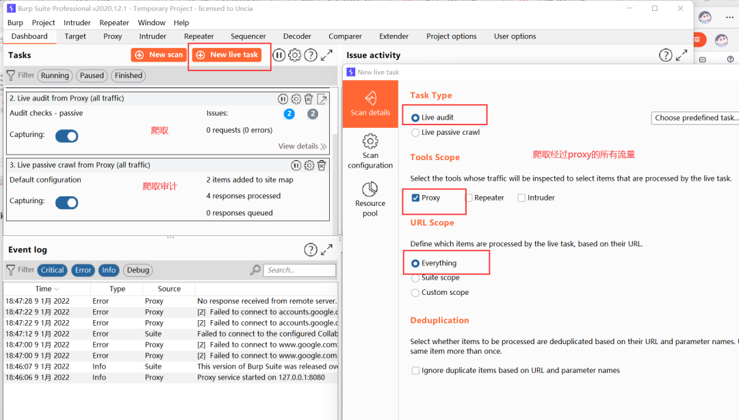 **vbs自启动脚本:**``DIM objShell``DIM command``set objShell=wscript.createObject("wscript.shell")``command="java -javaagent:BurpLoaderKeygen.jar -noverify -jar burpsuite_pro_v2021.7.jar"``iReturn=objShell.Run(command, 0, TRUE)``**bat脚本启动:**``java -javaagent:BurpLoaderKeygen.jar -noverify -jar burpsuite_pro_v2021.12.1.jar``12345678