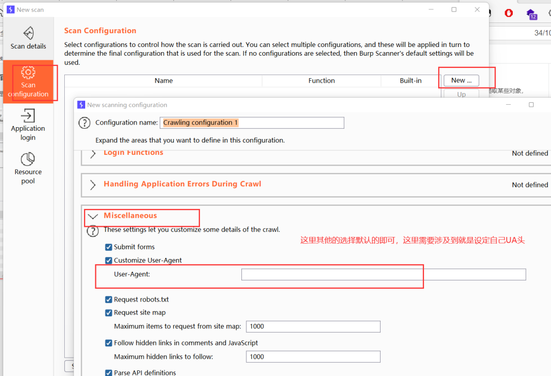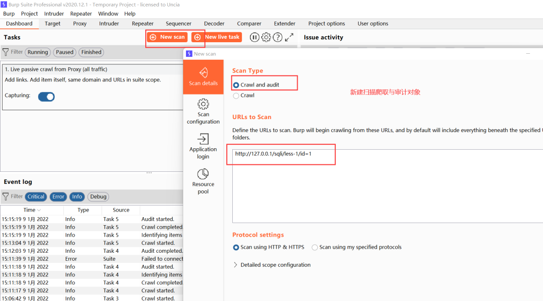 新建扫描对象,这里使用的是爬取与审计测试,下面protocol模块可以设定爬取的条件,即不爬取某些对象,