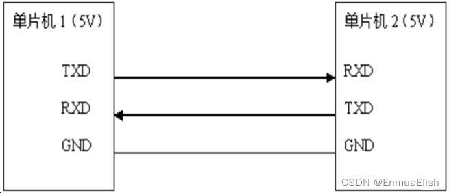 GND 表示单片机系统电源的参考地,TXD 是串行发送引脚,RXD 是串行接收引 脚。两个单片机之间要通信,首先电源基准得一样,所以我们要把两个单片机的 GND 相互 连接起来,然后单片机 1 的 TXD 引脚接到单片机 2 的 RXD 引脚上,即此路为单片机 1 发送 而单片机 2 接收的通道,单片机 1 的 RXD 引脚接到单片机 2 的 TXD 引脚上,即此路为单片 机 2 发送而单片机 1 接收的通道。这个示意图就体现了两个单片机相互收发信息的过程。