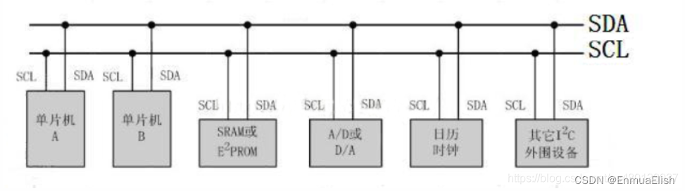 IIC总线的硬件,是由一根数据线SDA,一根时钟线SCL构成。不同的器件,都是并联接在这两条线上,I2C总线上的每个设备都自己一个唯一的地址,来确保不同设备之间访问的准确性。