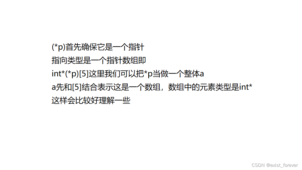 int(*p)[5];根据运算符的优先级别*先和p结合表明p是一个指针,指向类型是一个int型的数组数组中有5个int型元素。
