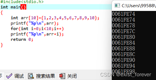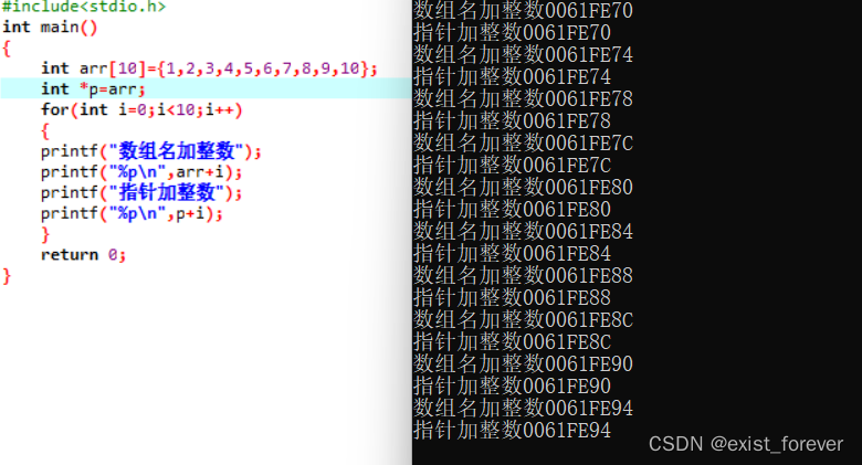我们根据输出的结果可以看到两者的输出结果是一致的,所以我们认为只要指针指向了数组,指针加整数可以实现访问数组中各个元素的地址。