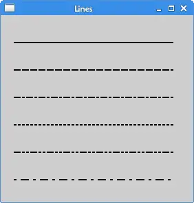 我们在窗口上绘制了六条线条,每个线条都有不同的笔触风格。