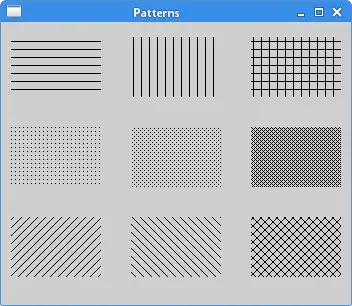 下面的编程代码例子与前一个类似。这一次我们用各种预定义的图案来填充矩形。