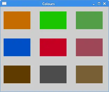 颜色是表示红色、绿色和蓝色(RGB)强度值组合的对象。有效的RGB值范围为0到255。在下面的示例中,我们绘制了九个填充有不同颜色的矩形。