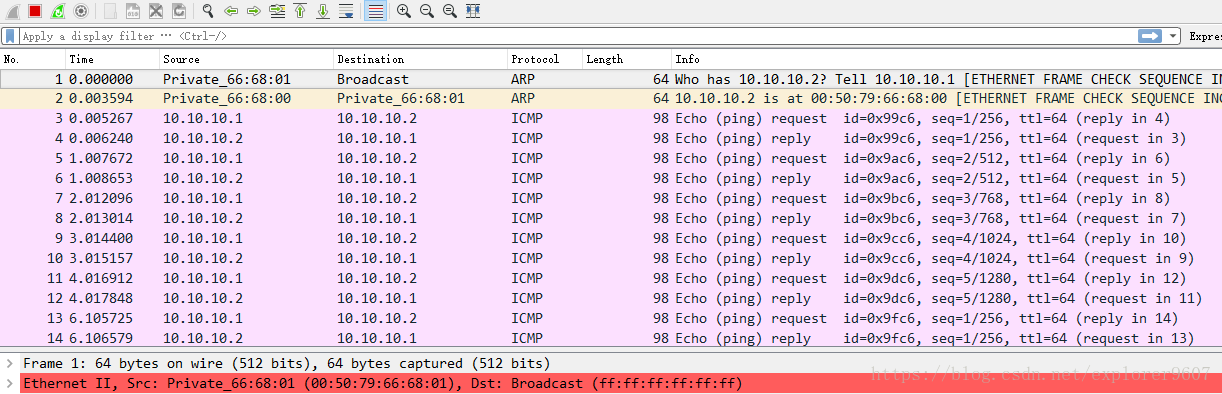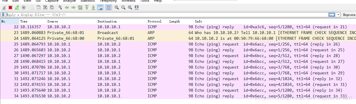 然后,同样两台虚拟机之间互相ping,ping完之后会发现,wireshark已经可以自动抓啦!