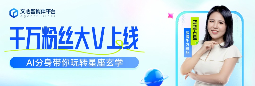上文心智能体平台,搜索「蓝蓝占星」,你的下一次“水逆”,或许会因为一次AI占星对话,变得不再那么难熬。