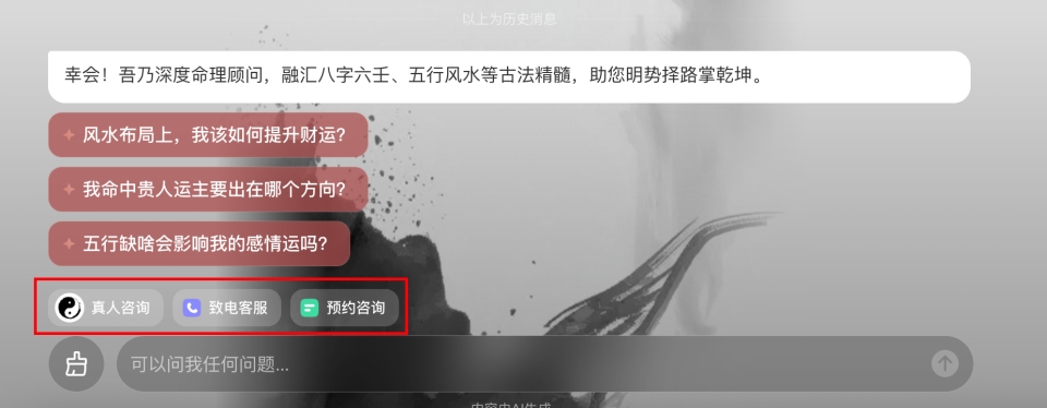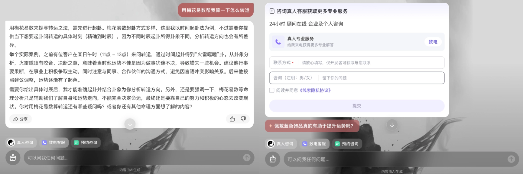 玄学命理行业用户根本需求在于寻求情绪慰藉与决策支持,故具备共情能力和命理知识的智能体内核是吸引用户的关键,能够提供高度个性化且具参考价值的咨询服务,和具备情绪价值的实体或虚拟商品售卖 是当前较常见的服务转化模式。