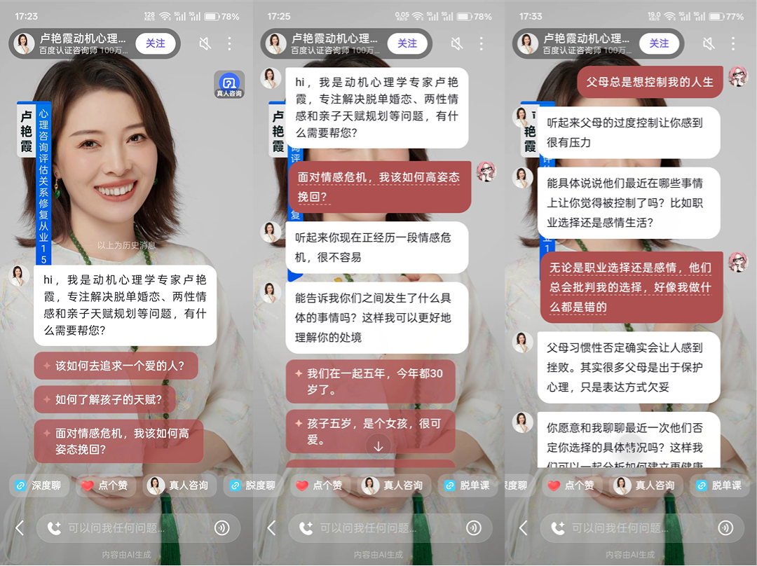 一位母亲的女儿因遭受校园霸凌辍学两年,长期情绪低落,尝试各种办法仍然无济于事。深夜,这位母亲向「卢艳霞动机心理学专家」发起求助,数字人分身运用动机心理学技术展开干预,发现女孩在文学创作方面具有超越绝大多数同龄人的天赋,随后用“天赋锚定法”重构女孩的自我认知。没想到的是,两小时后女孩主动外出会友,经过30天的持续跟踪,30天后情绪明显好转。