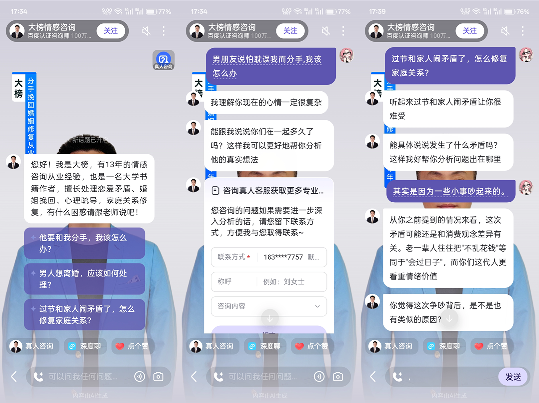 目前,文心智能体平台已经汇集了近1500名的“情感专家”,通过数字人智能体构建起高效、普惠、多元的情感服务生态,不仅革新了传统情感的服务方式,更为情感服务领域带来全新变革:
