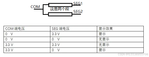 其中,COM表示公共端,SEG1、SEG2表示一个段极。假设COM端电压为0,则段极电压为3.3V的对应显示单元会亮。(注意:图中两个段仅为示意,实际可能是各种形状图标)假设COM端电压为3.3V,则段极电压为0的对应显示单元会亮。