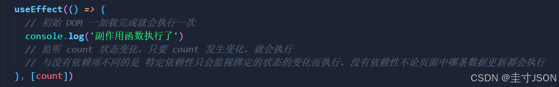 传入后,除了会在初始DOM渲染完成后执行一次,还会在绑定的状态变量每次发生变化后执行一次,相当于“监视”了这个状态,它一变我就执行: