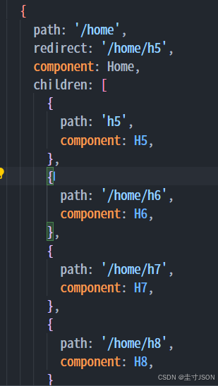 2.然后我们应当在router配置中的 ‘/home’ 路由对象中配置它的二级子路由;并且因为我们希望页面一跳转到 '/home' 页面,就默认展示地址为 '/h5' 的子路由,所以我们在 '/home' 路由对象中通过 redirect 配置项,重定向到 '/home/h5' 的页面,这样一旦跳转到 '/home' 的页面重定向到 '/home/h5' 的页面。