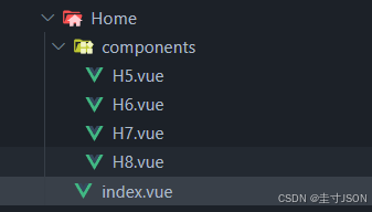 1.首先H5这部分属于 网站首页 地址为 ‘/home’ 下的页面,并且它是一个左侧导航的结构,通过点击左侧导航不同的标签项来实现右侧区域展示不同内容的效果,这明显是一个二级路由,所以我们先创建二级路由页面,在Home页文件夹下新建一个component文件夹,这里存放关于Home页的二级路由组件
