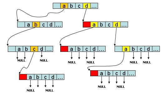 该trie树存有abc、d、da、dda四个字符串,如果是字符串会在节点的尾部进行标记。没有后续字符的branch分支指向NULL