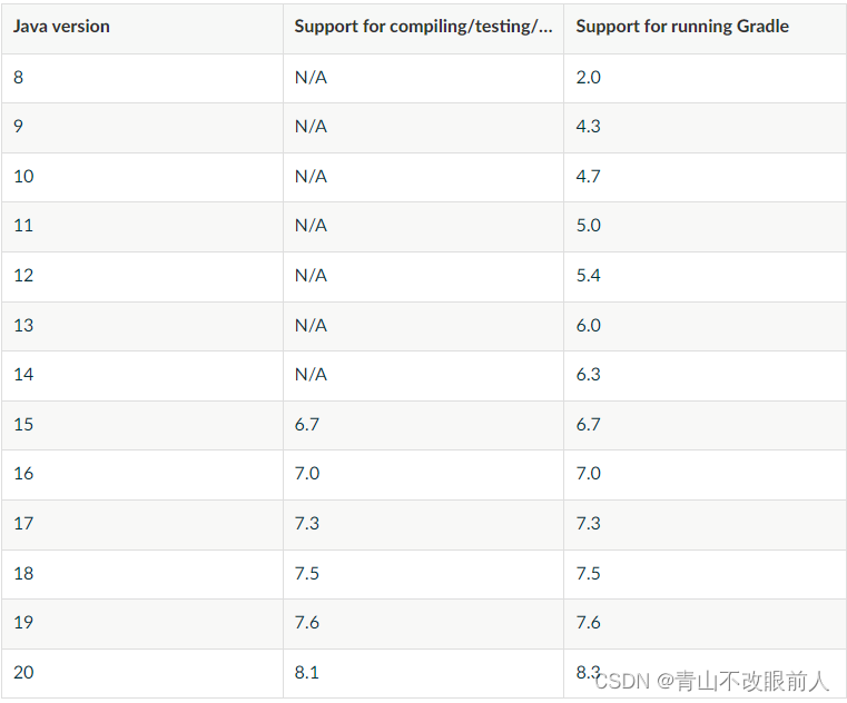 项目使用gradle为编译工具,gradel和jdk版本对应关系如下