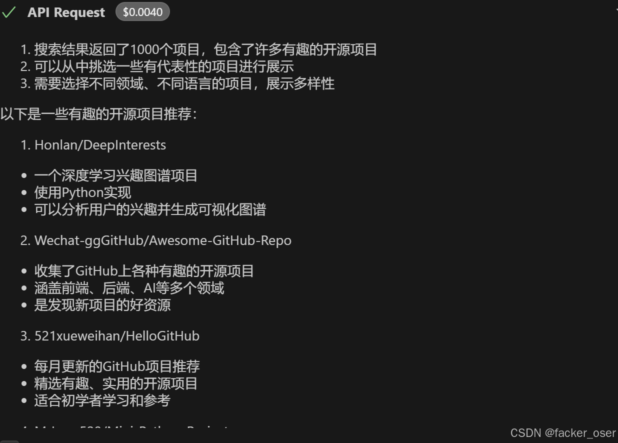 那么,现在再去问LLM在GitHub上有什么好玩的项目值得推荐,这个LLM就可以通过Tool去获得GitHub上的信息。它的工作流程就变成用户询问LLM,LLM在使用Tool去解决这个问题,然后返回相应的信息给LLM,最LLM将整理好的信息回答给用户。