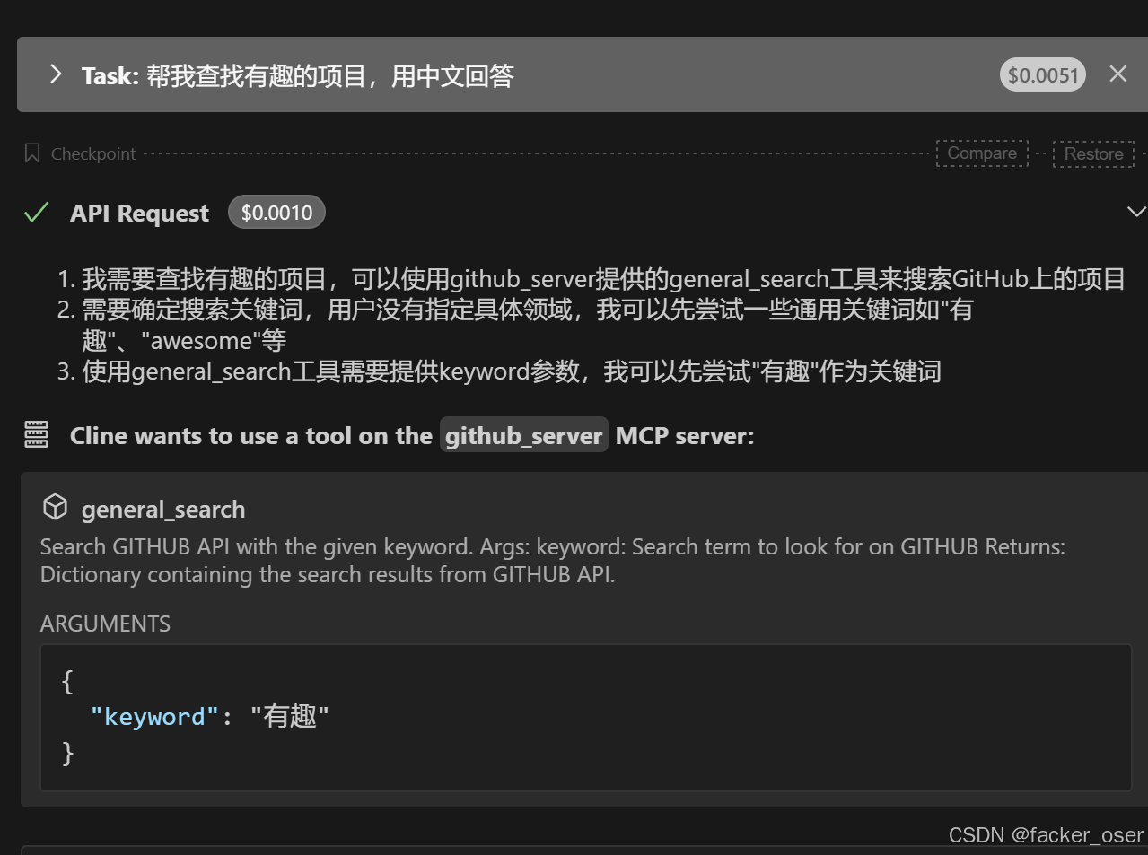 我们打开main.py这个文件,修改里面的内容,并把这个文件的名字改成github_server.py,general_search函数一定要写详细你的docstring,这样子LLM才知道这个函数是干什么的。