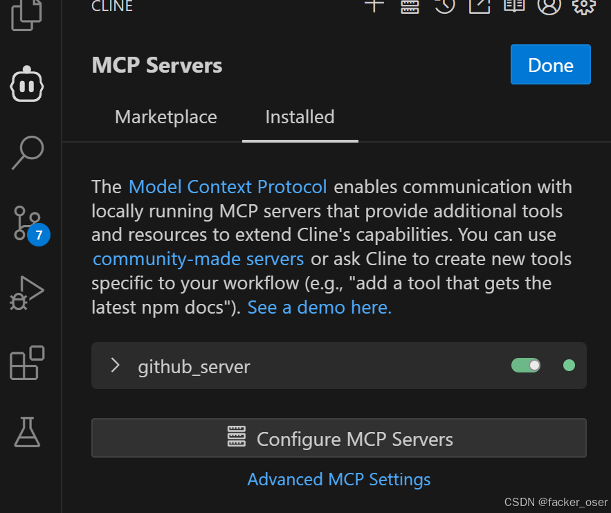 定义好了MCP Server之后,找一个Client和它连接,这里我使用的是Vs code插件里的Client,需要配置好模型的API,这里就不赘述了。找到Client然后打开MCP Server点击Installed找到Configure MCP Servers,写好MCP Server。这里由于我使用的是uv,所以command里写的就是uv,如果你使用的不是uv,那么你就写python,args里不是使用uv的话就只写路径和文件名即可,这样子就配置好了MCP Server,就可以看见这里是绿色的小点。
