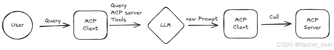 MCP的工作流程,就是通过User发送Query,Client根据这个Query和MCP Server还有Tools去形成一个新的Prompt发送给LLM,LLM通过这个新Prompt调用MCP Client,MCP Client再去MCP Server里调用对应的Tool。