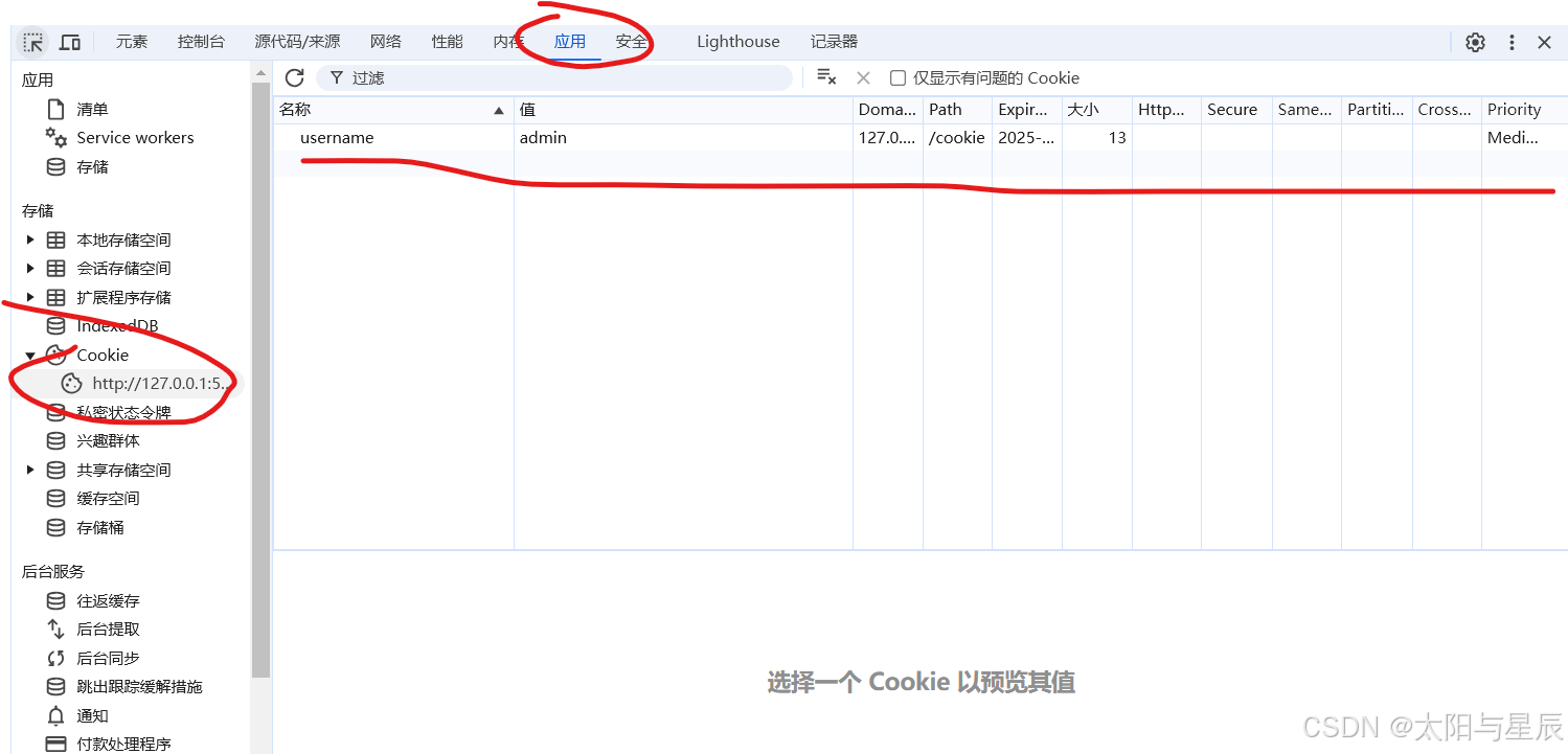 如上,执行上述页面代码后。如浏览器控制面板中的应用部分查看,会发现cookie生效。