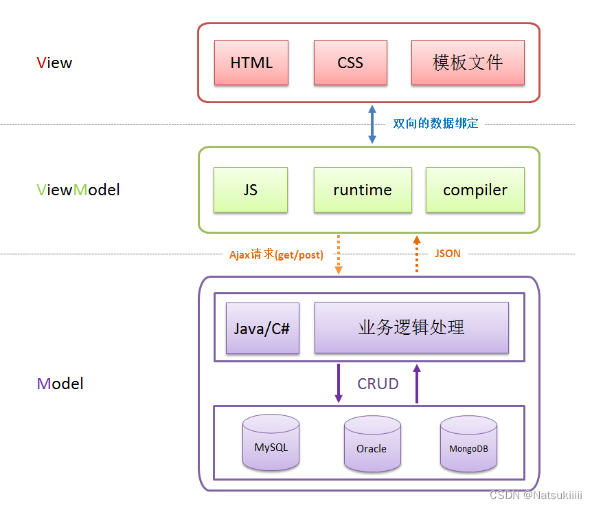 ViewModel 层:是由前端开发人员组织生成和维护的视图数据层。在这一层,前端开发者对从后端获取的 Model 数据进行转换处理,做二次封装,以生成符合 View 层使用预期的视图数据模型