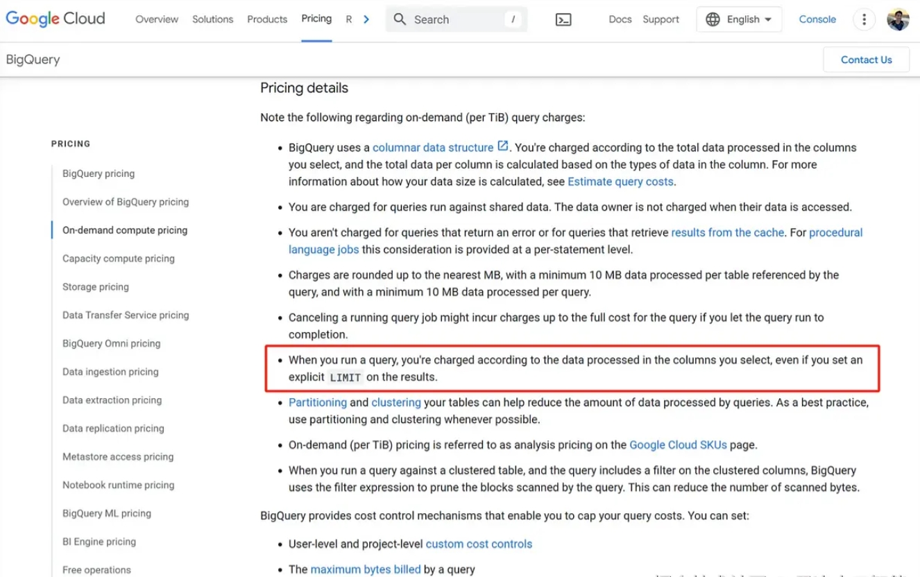 - LIMIT 并不会减少计费数据量——你的查询只要“碰”到了大表,你就得为整个表买单