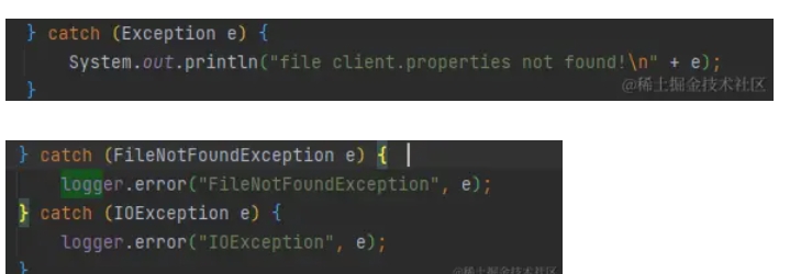 先不说双打的事,对于上图这个,应该输出包括堆栈信息,不然定位问题很麻烦,有人可能会说e.getMessage()最好,可是生产问题看多了发现还是打堆栈好;还有如果不是定向返回信息,仅仅是记录日志,完全没必要catch多个异常,一个Exception足够了,不知道原作者这么写的意思是啥;还是就是打印日志要用logger,用sout打印在控制台,那我日志文件干啥;