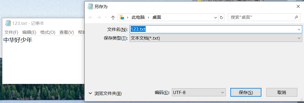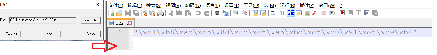 注意:上例程中的“中华好少年”编码是通过U2C.exe文件编码转换得到的,转换过程如下图,首先新建文本文件输入字库对应的文本如“中华好少年”,选择UTF-8编码保存,再利用U2C.exe小程序进行转换就可以得到相应的C文件,里面有文本的编码字符串