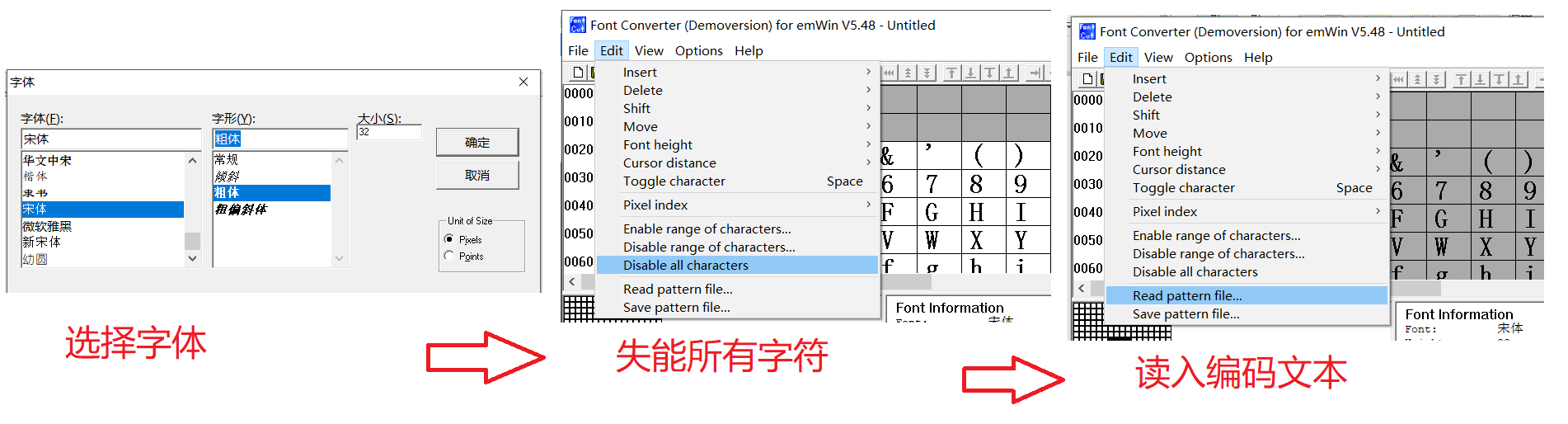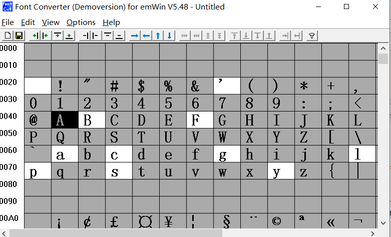 1.2、然后打开字体库转换软件FontCvtDemo.exe,设置好需要显示的字体,然后点击Edit>>Disable all characters屏蔽所有字符(默认是选择所有全字库,我们按需选择),接着点击Edit>>Read pattern file...,在对话框中选择我们上一步建立的文本Font.txt,我们可以在程序界面看到我们之前文本中的输入的字符处于选中状态,下图中只显示了英文字符的一部分,如果需要查看中文字符是否被选中可以先将中文字符转换为unicode码,再在程序中找到对应的位置即可,Unicode编码转换网址如:http://tool.chinaz.com/tools/unicode.aspx