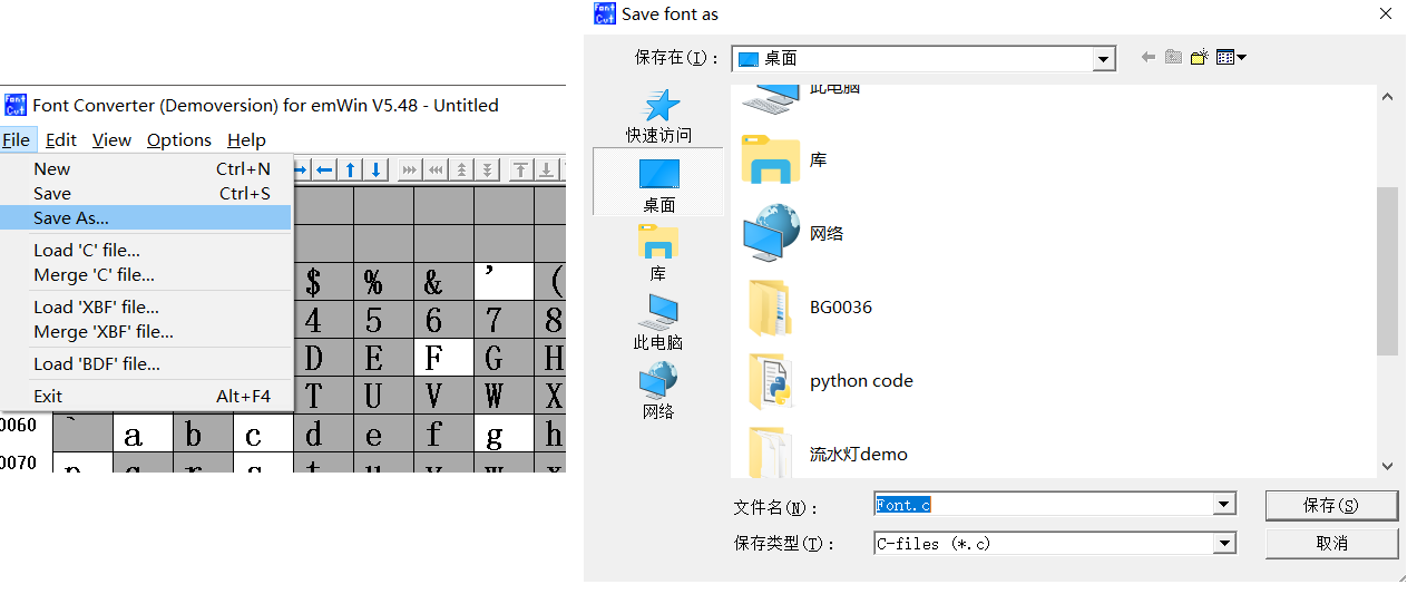 1.3、成功导入文本后,在点击File>>Save as另存为c文件,这个C文件就是我们建立的小字体库