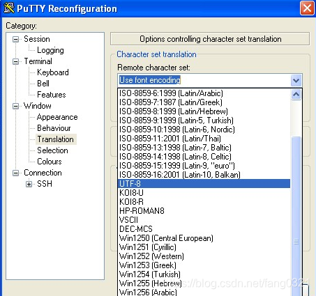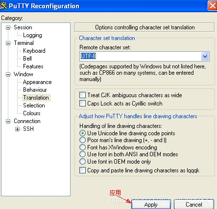 2. 将putty使用的编码修改为服务器系统当前使用的编码,也就是utf编码,如下图所示