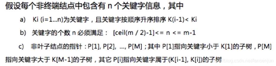 - 除根节点和叶节点外,其他每个节点至少有ceil(m/2)个孩子