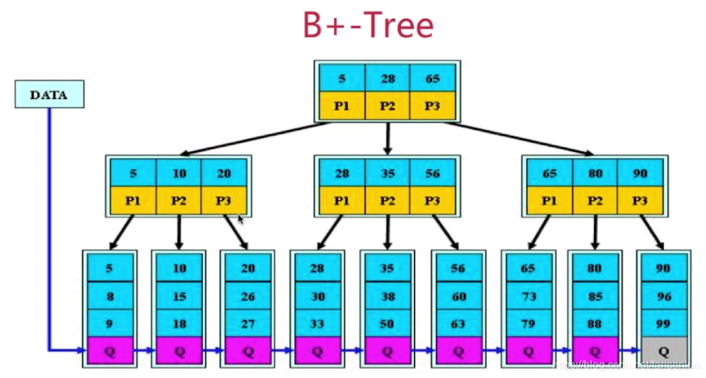 - 非叶子节点的子树指针P[i],指向关键字值[k[i],k[i-1])的子树