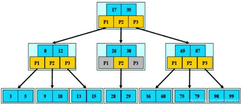 又叫做平衡多路查找树,如果每个节点最多有m个孩子,那么这样的树就叫做m阶B-Tree树,如下图就是一个3阶B树,每个存储块中都包含了关键字和指向孩子的指针,最多有几个孩子取决于存储块的容量以及数据库的相关配置,所以通常情况下这个m是很大的