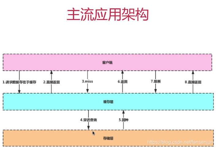 一般为了提升性能,会在存储层和客户端之间添加一个缓存层,当客户端向后端发送请求的时候,会先去缓存层查,看看是否有相应的数据,如果有则直接返回,这样就减轻存储层的压力,如果缓存层没有相关数据,才会去到存储层去查询,这就是我们行业里所说的穿透。如果存储层有数据则会将数据返回给缓存层,以便客户端下次请求同样的数据时,可以直接从缓存层取数据,回写的过程就是回种,回种之后将结果返回给客户端,完成一次请求响应的操作。熔断:当发现存储层挂掉,可以让客户端的请求直接打在缓存层上,不管有没有获取到数据直接返回,因此缓存很重要。