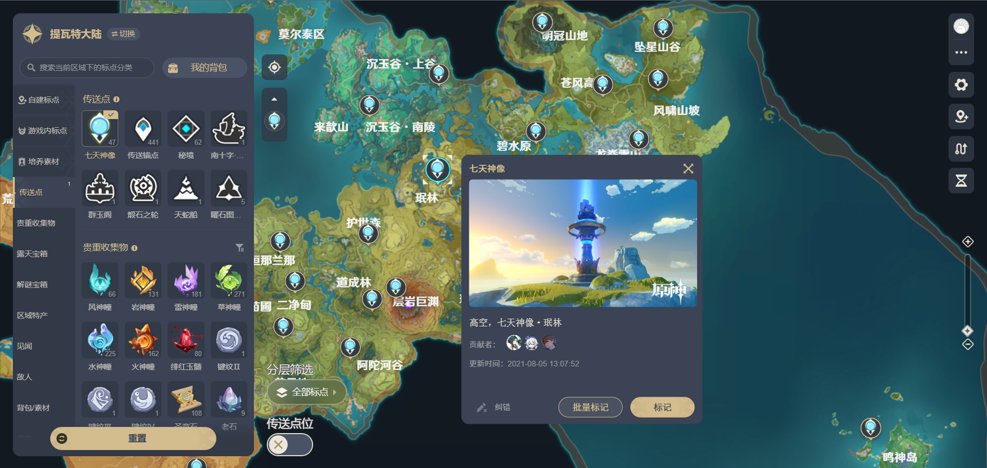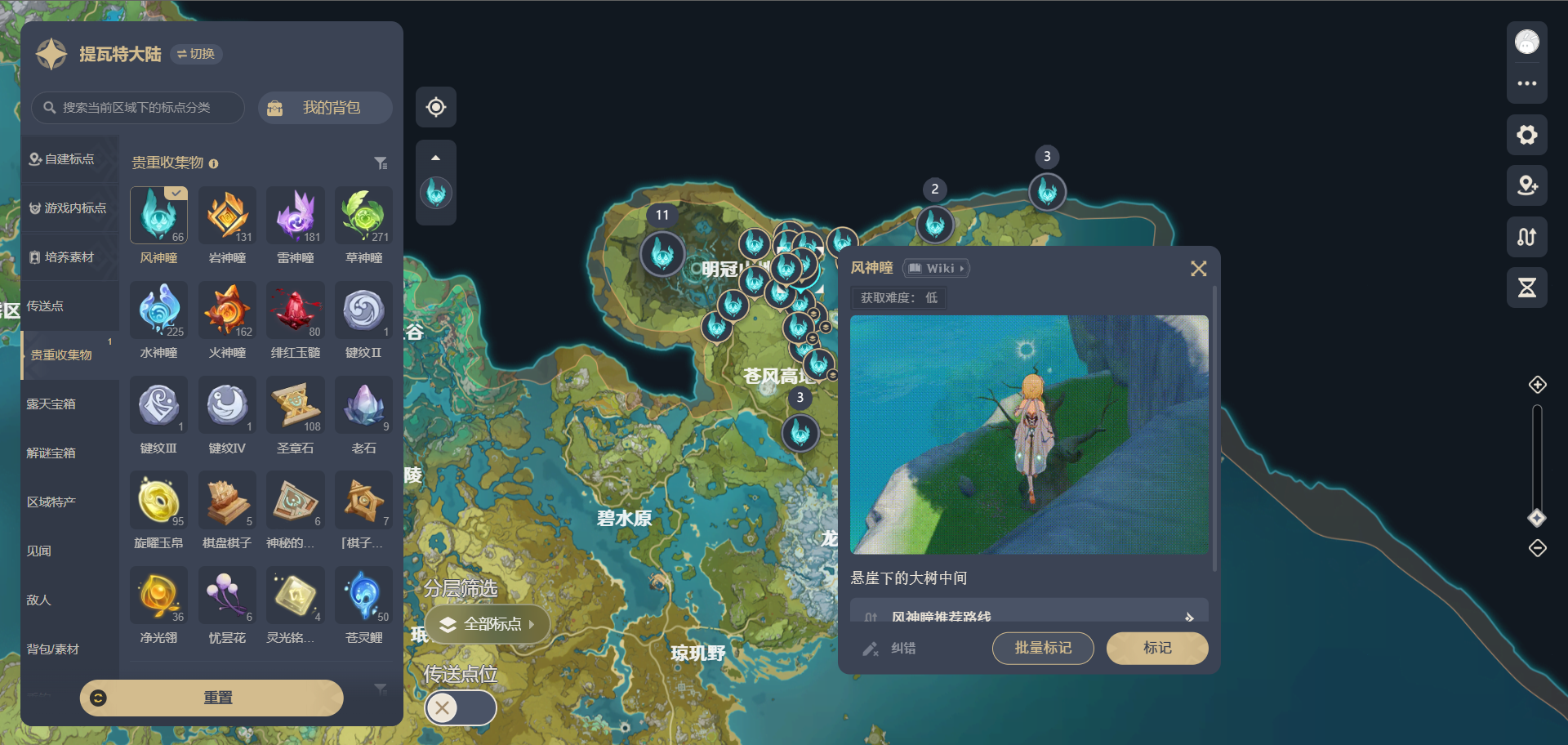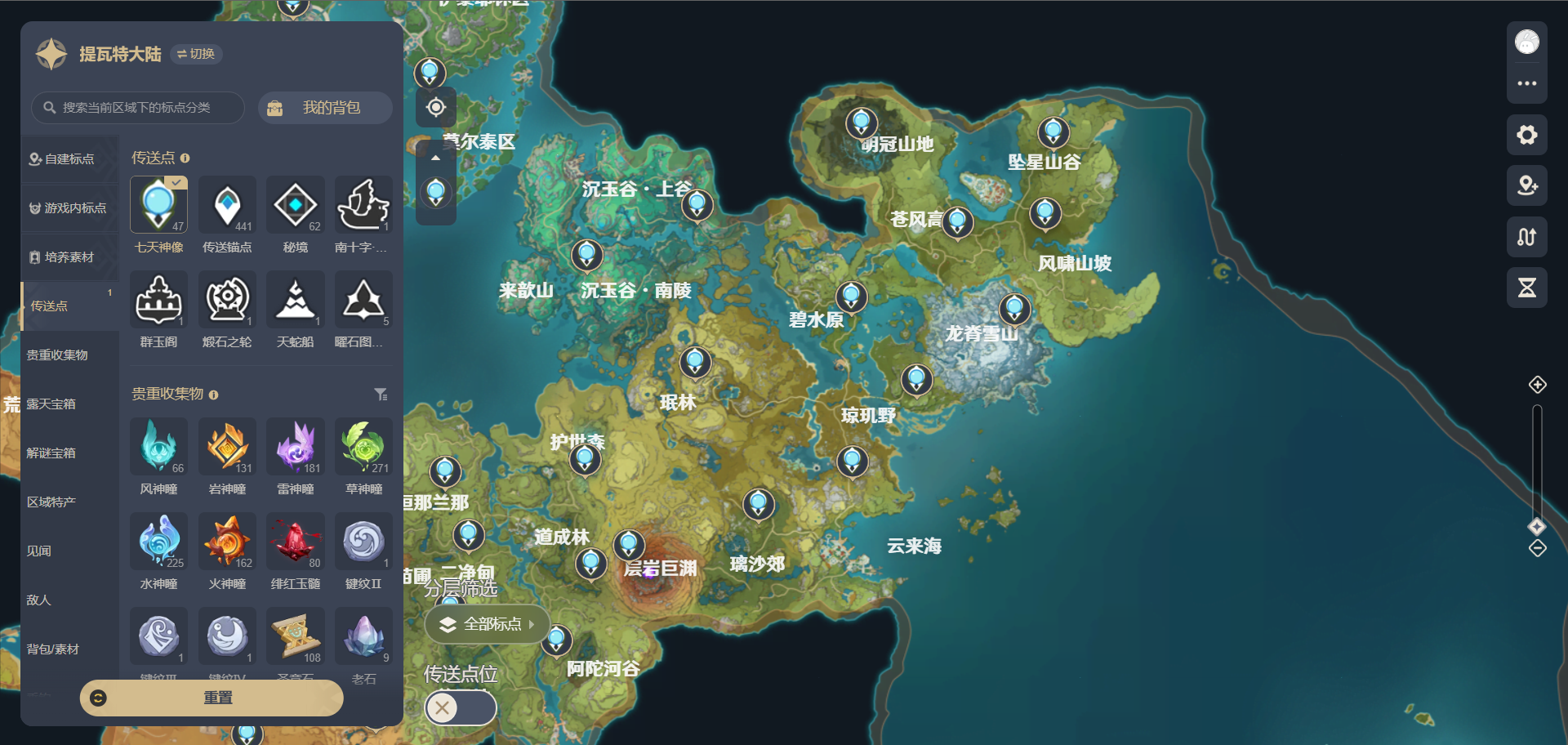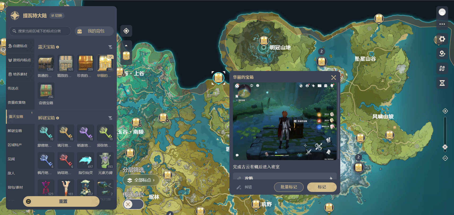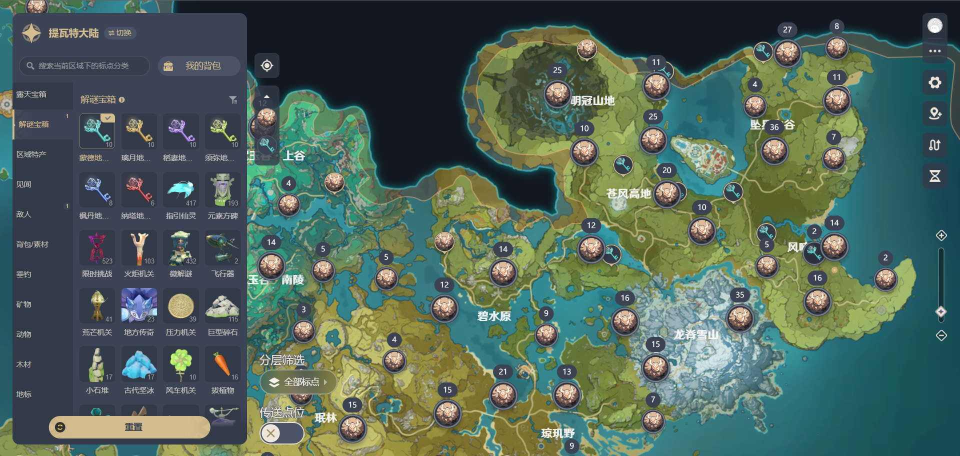 - 一键筛选资源:地图上会用不同图标标出传送点、宝箱(普通/华丽/解密)、矿物、特产、敌人等8类资源,勾选需要的类型就能快速显示,再也不用满地图乱跑。