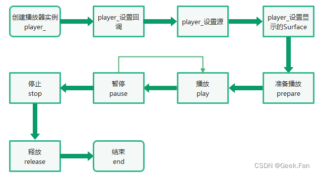 首先根据RunCase可以大致了解一下播放音视频的主要流程,创建播放器,设置播放源,设置回调方法(包含播放过程中的多种状态的回调),设置播放显示的Surface,这些准备工作做好之后,需要调用播放器的PrepareASync方法,这个方法完成后,播放状态会变成Prepared状态,这时就可以调用播放器的play接口,进行音视频的播放了。RegisterTable()方法中,将字符串和对应的方法映射到Map中,这样后续的DoNext会根据输入的命令,来决定播放器具体的操作。