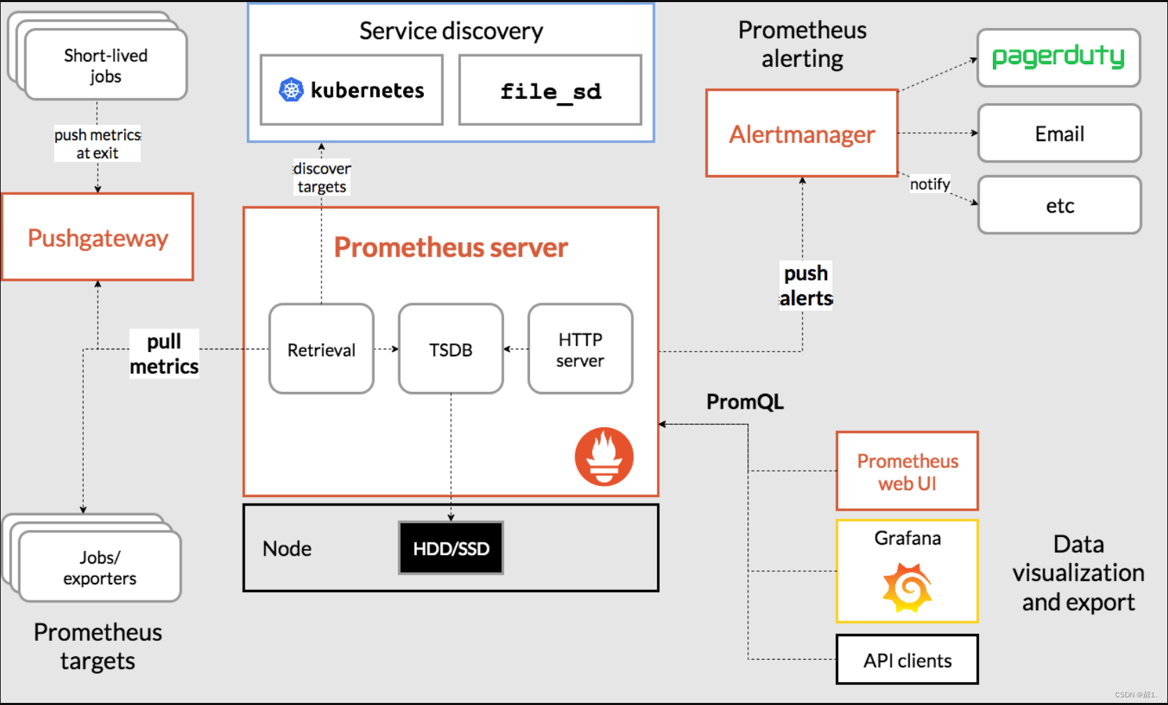 - 可视化: prometheus server自带一个ui, 通过这个ui可以方便对数据进行查询和图形化展示,可以对接grafana可视化工具展示精美监控指标。
