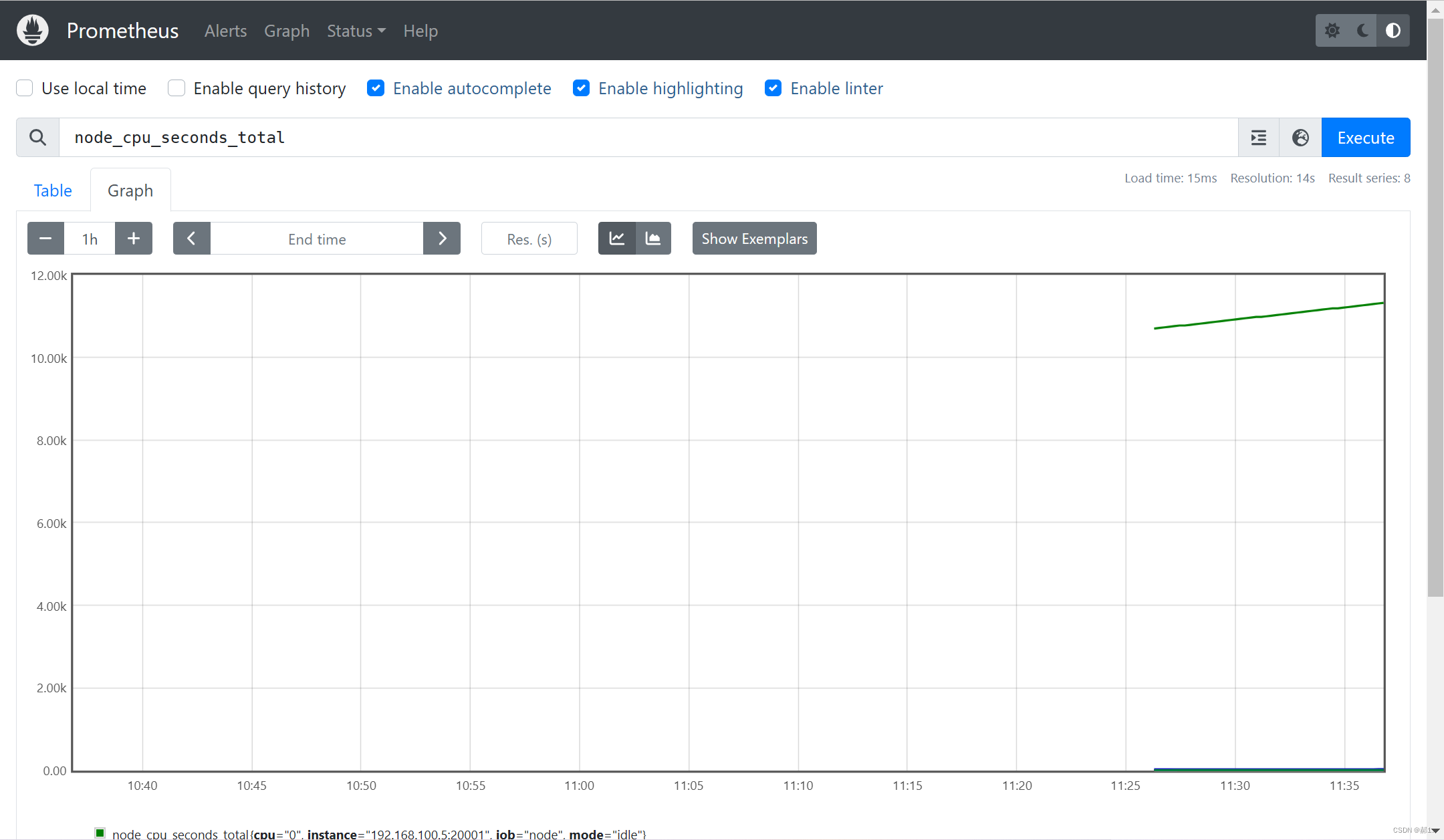 例如node_load1该指标反映了当前主机在最近一分钟以内的负载情况,系统的负载情况会随系统资源的使用而变化,因此node_load1反映的是当前状态,数据可能增加也可能减少,从注释中可以看出当前指标类型为仪表盘(gauge),与指标反映的实际含义一致。