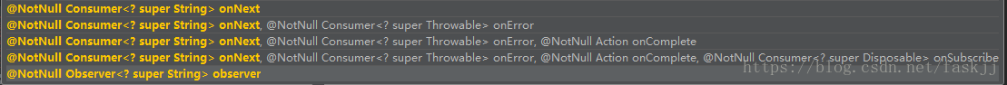 Observable与Observer两者通过subscribe()来相关连。而subscribe() 有多个重载方法,下面的是 subscribe()的不同的参数