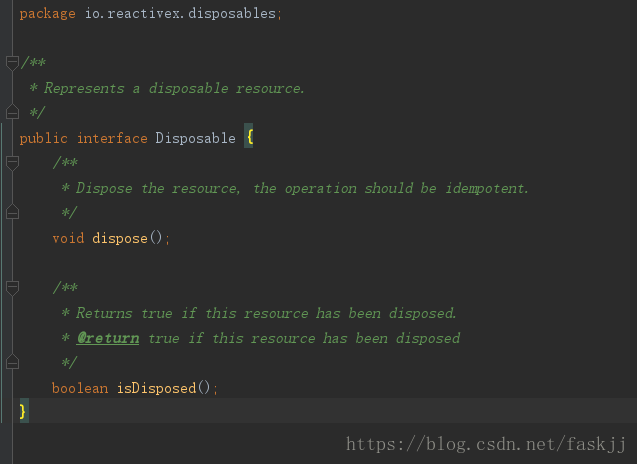 方法,subscribe()与onNext()在循环中多次被执行到。先来看一下onSubcribe()这个方法有什么用。可以在这个方法中看到有一个参数Disposable,那么这个参数的作用又是什么呢?通过查看源码看到这个参数实际是一个接口。代表的是一个可以支配的资源。源码如下: