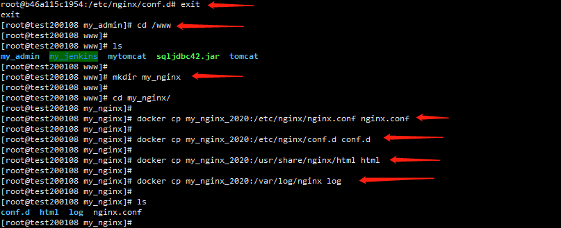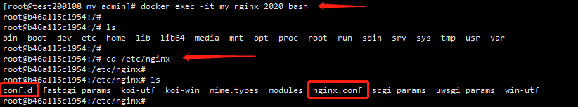 A、登录nginx容器。docker exec -it my_nginx_2020 bash。进入/etc/nginx 查看文件列表,其中nginx.conf 配置nginx的全局基础属性配置。conf.d 存放访问路径的配置文件,本文不介绍nginx相关使用介绍,请自行搜索配置参数含义~~