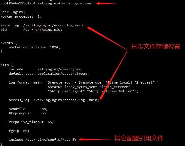 B、more nginx.conf 查看配置内容。通过文件内容可以看到日志是存储在容器的 /var/log/nginx 文件夹下。更多配置要去conf.d 文件夹下查看。