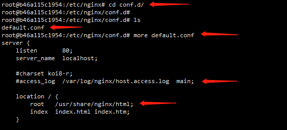 C、查看conf.d文件夹内文件配置。看到conf.d文件夹下只有一个default.conf文件,more default.conf 查看其内容,也可看到日志文件存储在/var/log/nginx文件夹下,而项目html和静态文件保存在/usr/share/nginx/html下。